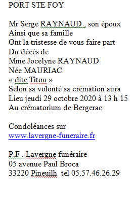 Décédée à Sainte-Foy-la-Grande (33220, France) le samedi 24 octobre 2020 à l'âge de 67 ans
