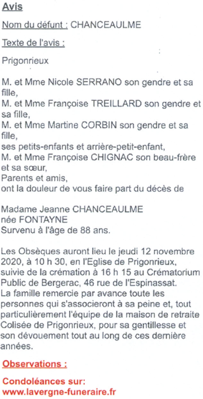 Madame Jeanne CHANCEAULME née FONTAYNE