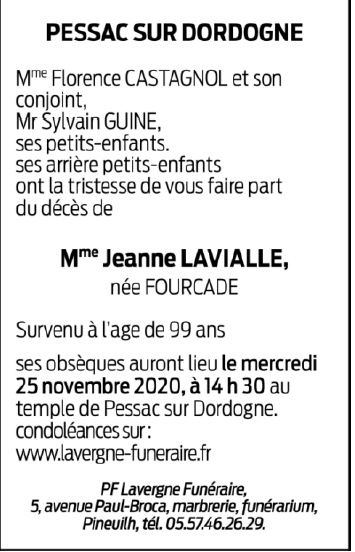 Décédée à Prigonrieux (24130, France) le dimanche 22 novembre 2020 à l'âge de 99 ans