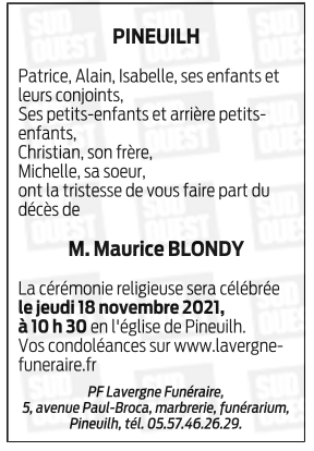 Décédé à Sainte-Foy-la-Grande (33220, France) le dimanche 14 novembre 2021 à l'âge de 92 ans