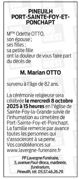 Décédé à Sainte-Foy-la-Grande (33220, France) le samedi 4 octobre 2025 à l'âge de 82 ans