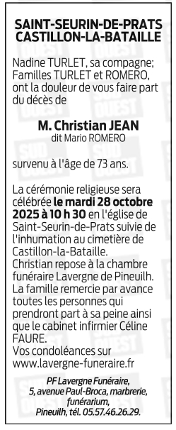 Décédé à Libourne (33500, France) le lundi 20 octobre 2025 à l'âge de 73 ans