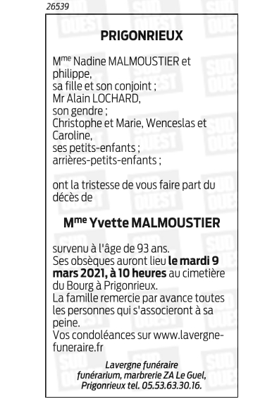Veuve de Monsieur Pierre MALMOUSTIER