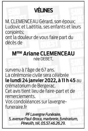 Décédée à Libourne (33500, France) le jeudi 20 janvier 2022 à l'âge de 67 ans