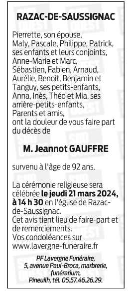 Décédé à Razac-de-Saussignac (24240, France) le dimanche 17 mars 2024 à l'âge de 92 ans