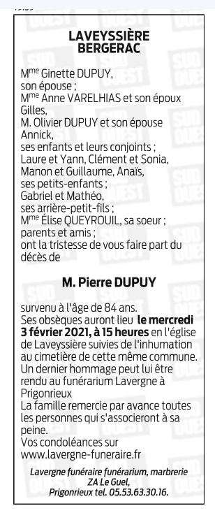 Décédé à Bergerac (24100, France) le samedi 30 janvier 2021 à l'âge de 84 ans