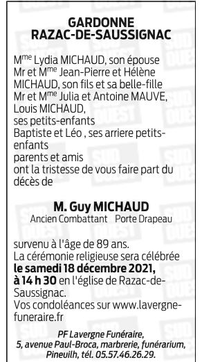 Décédé à Gardonne (24680, France) le lundi 13 décembre 2021 à l'âge de 89 ans