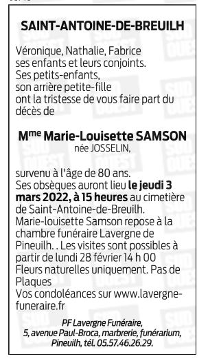 Décédée à Saint-Antoine-de-Breuilh (24230, France) le vendredi 25 février 2022 à l'âge de 80 ans