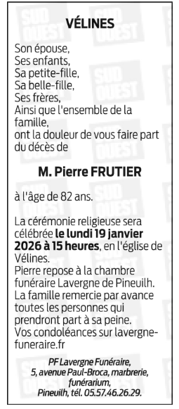 Décédé à Vélines (24230, France) le mercredi 14 janvier 2026 à l'âge de 82 ans