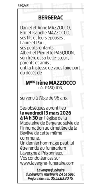 Décédée à Prigonrieux (24130, France) le lundi 9 mars 2026 à l'âge de 96 ans