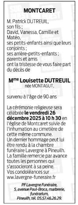 Madame Louisette DUTREUIL née MONTAGUT