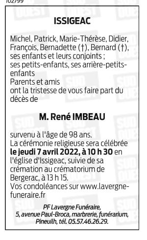 Décédé à Lamothe-Montravel (24230, France) le vendredi 1 avril 2022 à l'âge de 98 ans