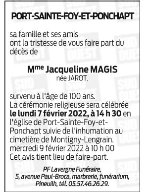 Décédée à Sainte-Foy-la-Grande (33220, France) le dimanche 30 janvier 2022 à l'âge de 100 ans