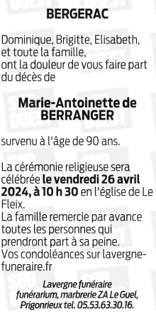 Décédée à Périgueux (24000, France) le lundi 22 avril 2024 à l'âge de 90 ans