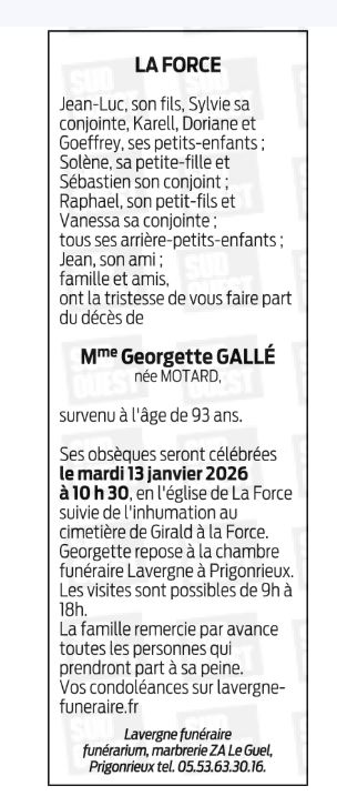 Décédée à Bergerac (24100, France) le mardi 6 janvier 2026 à l'âge de 93 ans