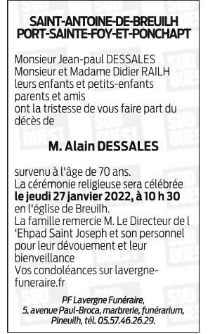Décédé à Port-Sainte-Foy-et-Ponchapt (33220, France) le samedi 22 janvier 2022 à l'âge de 70 ans
