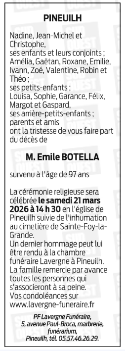 Décédé à Sainte-Foy-la-Grande (33220, France) le dimanche 15 mars 2026 à l'âge de 97 ans