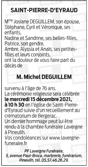 Décédé à Sainte-Foy-la-Grande (33220, France) le vendredi 10 décembre 2021 à l'âge de 76 ans