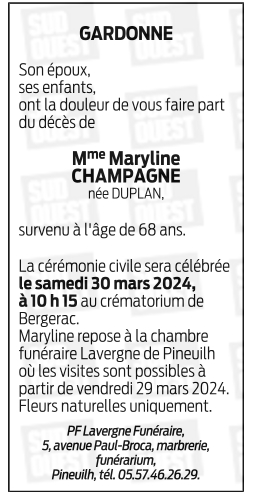 Décédée à Bordeaux (33000, France) le mardi 26 mars 2024 à l'âge de 68 ans