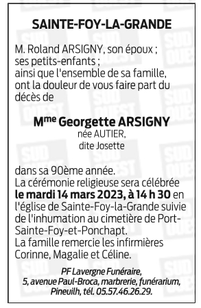 Décédée à Sainte-Foy-la-Grande (33220, France) le mercredi 8 mars 2023 à l'âge de 89 ans