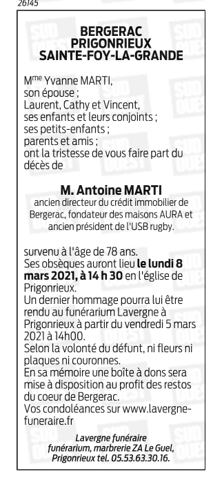 Décédé à Bergerac (24100, France) le mardi 2 mars 2021 à l'âge de 78 ans