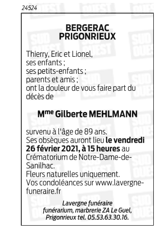 Décédée à Bergerac (24100, France) le lundi 22 février 2021 à l'âge de 89 ans