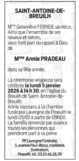 Décédée à Saint-Antoine-de-Breuilh (24230, France) le samedi 27 décembre 2025 à l'âge de 95 ans