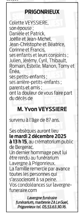 Décédé à Bergerac (24100, France) le mardi 25 novembre 2025 à l'âge de 87 ans