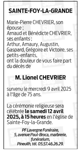 Décédé à Sainte-Foy-la-Grande (33220, France) le mercredi 9 avril 2025 à l'âge de 75 ans