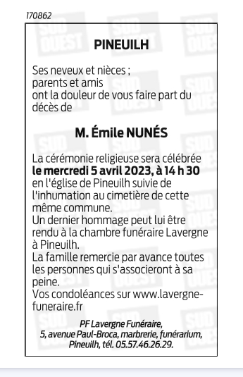 Veuf de Madame Virginie Jeanne Georgette NUNÉS née BERTHELIER