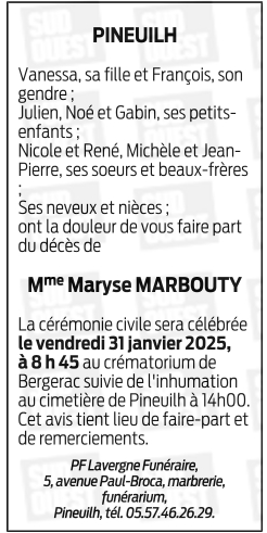 Décédée à Pineuilh (33220, France) le dimanche 26 janvier 2025 à l'âge de 72 ans