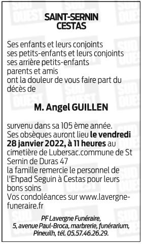 Décédé à Cestas (33610, France) le dimanche 23 janvier 2022 à l'âge de 104 ans