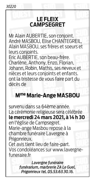 Décédée à Bergerac (24100, France) le samedi 20 mars 2021 à l'âge de 63 ans