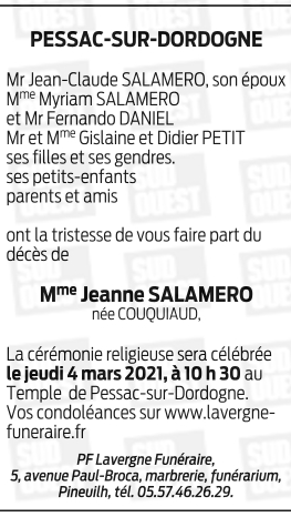 Décédée à Cenon (33150, France) le vendredi 26 février 2021 à l'âge de 75 ans
