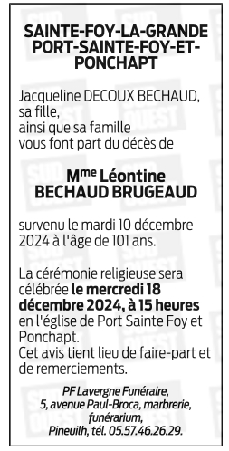 Décédée à Port-Sainte-Foy-et-Ponchapt (33220, France) le mardi 10 décembre 2024 à l'âge de 101 ans