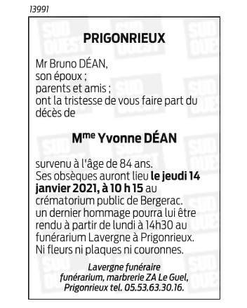 Décédée à Bergerac (24100, France) le vendredi 8 janvier 2021 à l'âge de 84 ans