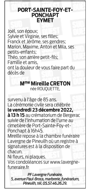 Domiciliée à Port-Sainte-Foy-et-Ponchapt (33220, France)