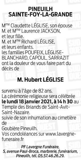 Décédé à Sainte-Foy-la-Grande (33220, France) le mercredi 13 janvier 2021 à l'âge de 82 ans