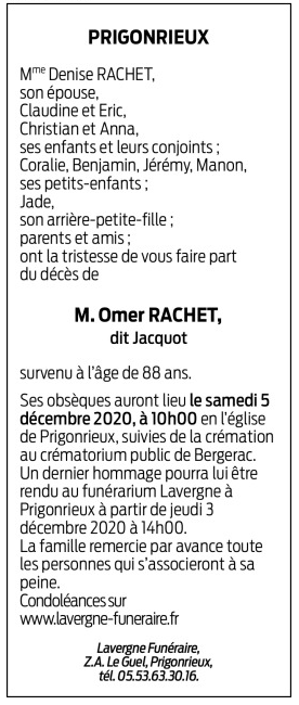 Décédé à Prigonrieux (24130, France) le mardi 1 décembre 2020 à l'âge de 88 ans