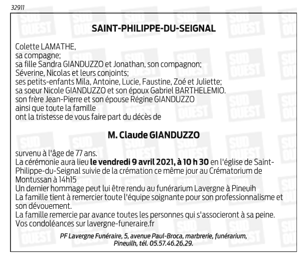 Décédé à Saint-Philippe-du-Seignal (33220, France) le dimanche 4 avril 2021 à l'âge de 77 ans