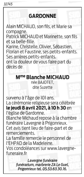 Décédée à Bergerac (24100, France) le dimanche 4 avril 2021 à l'âge de 101 ans