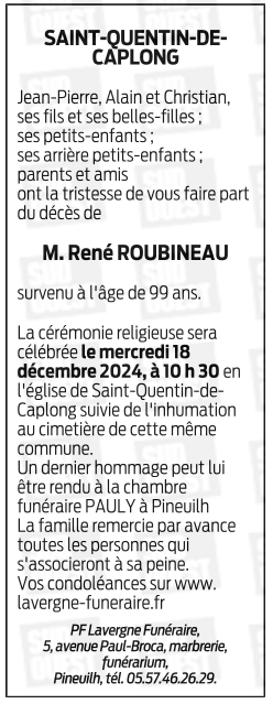 Décédé à Sainte-Foy-la-Grande (33220, France) le samedi 14 décembre 2024 à l'âge de 99 ans