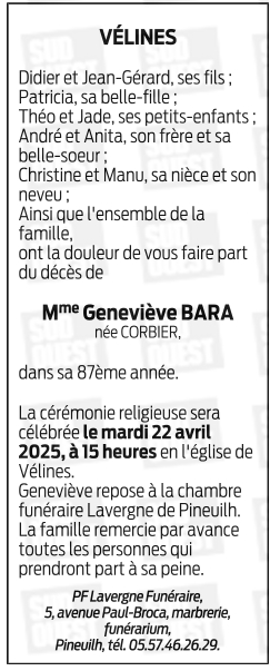 Veuve de Monsieur Gérard BARA