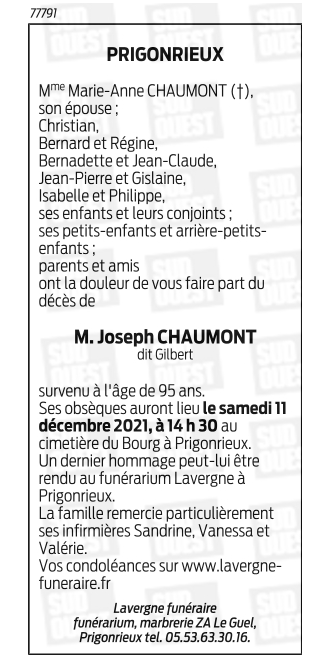 Décédé à Bergerac (24100, France) le mercredi 8 décembre 2021 à l'âge de 95 ans