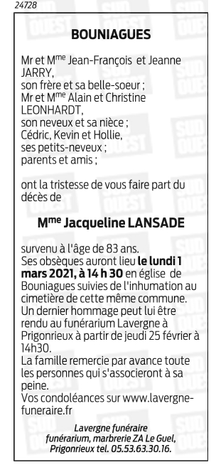 Décédée à Bergerac (24100, France) le mardi 23 février 2021 à l'âge de 83 ans