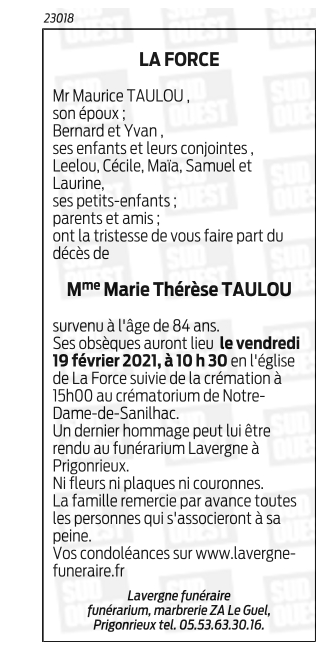 Epouse de Monsieur Maurice TAULOU