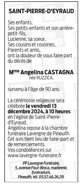 Décédée à Port-Sainte-Foy-et-Ponchapt (33220, France) le dimanche 8 décembre 2024 à l'âge de 90 ans