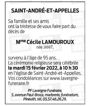 Décédée à Sainte-Foy-la-Grande (33220, France) le vendredi 11 février 2022 à l'âge de 95 ans