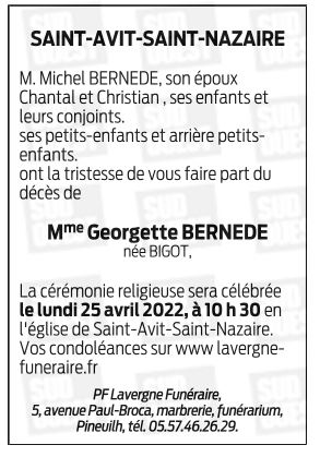 Décédée à Saint-Avit-Saint-Nazaire (33220, France) le vendredi 22 avril 2022 à l'âge de 91 ans